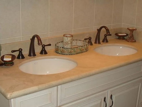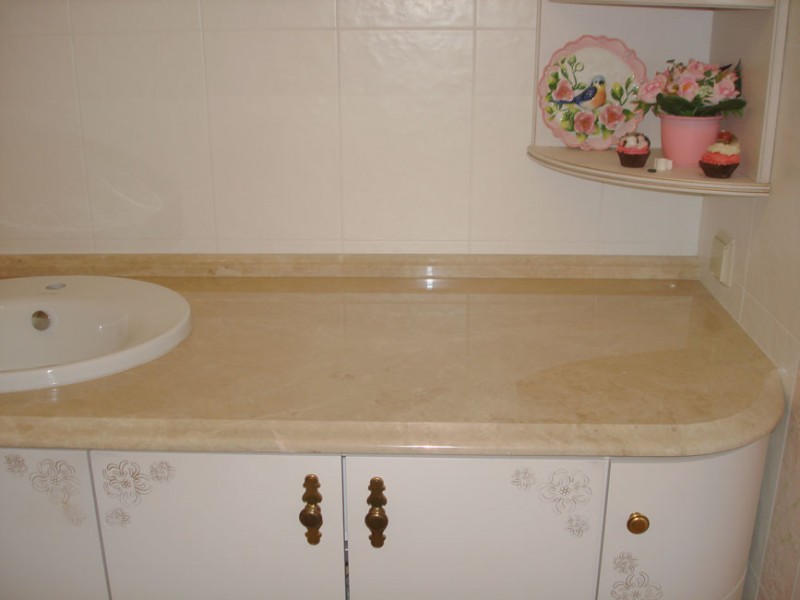 Столешница мрамор бежевый достойно сочетается с идентичными или контрастными оттенками. Практичность искусственного камня неоспорима, поэтому применение допустимо в ванной комнате и на кухне.